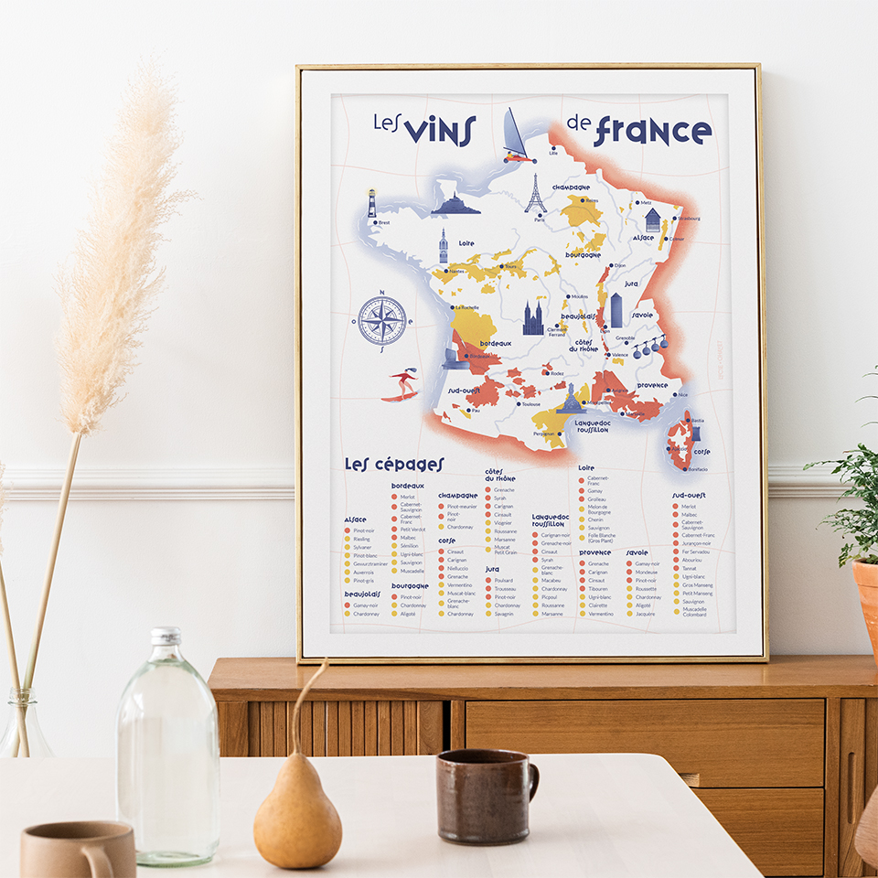 Une carte colorée et détaillée, entre monuments et vignobles, qui apportera une touche française et chaleureuse à votre intérieur.